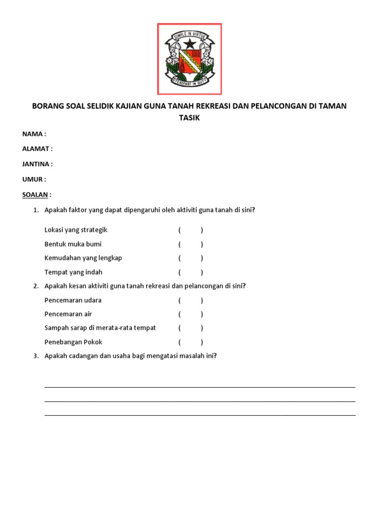 Borang Soal Selidik Kajian Guna Tanah Rekreasi Dan Pelancongan Di Taman Tasik Pdf